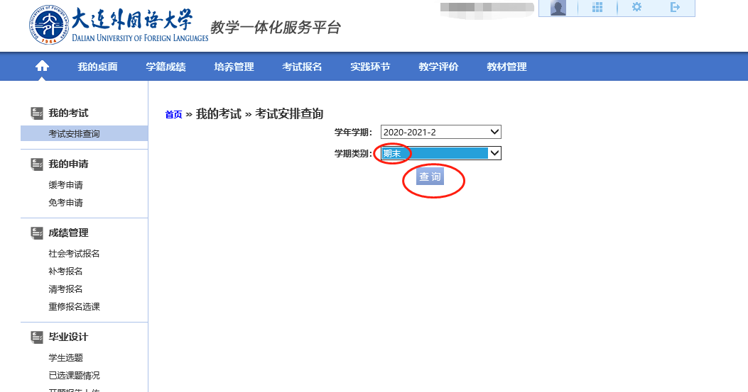 选择需要查询的学期和学期类别后,点击查询,即可查看具体考试科目安排。